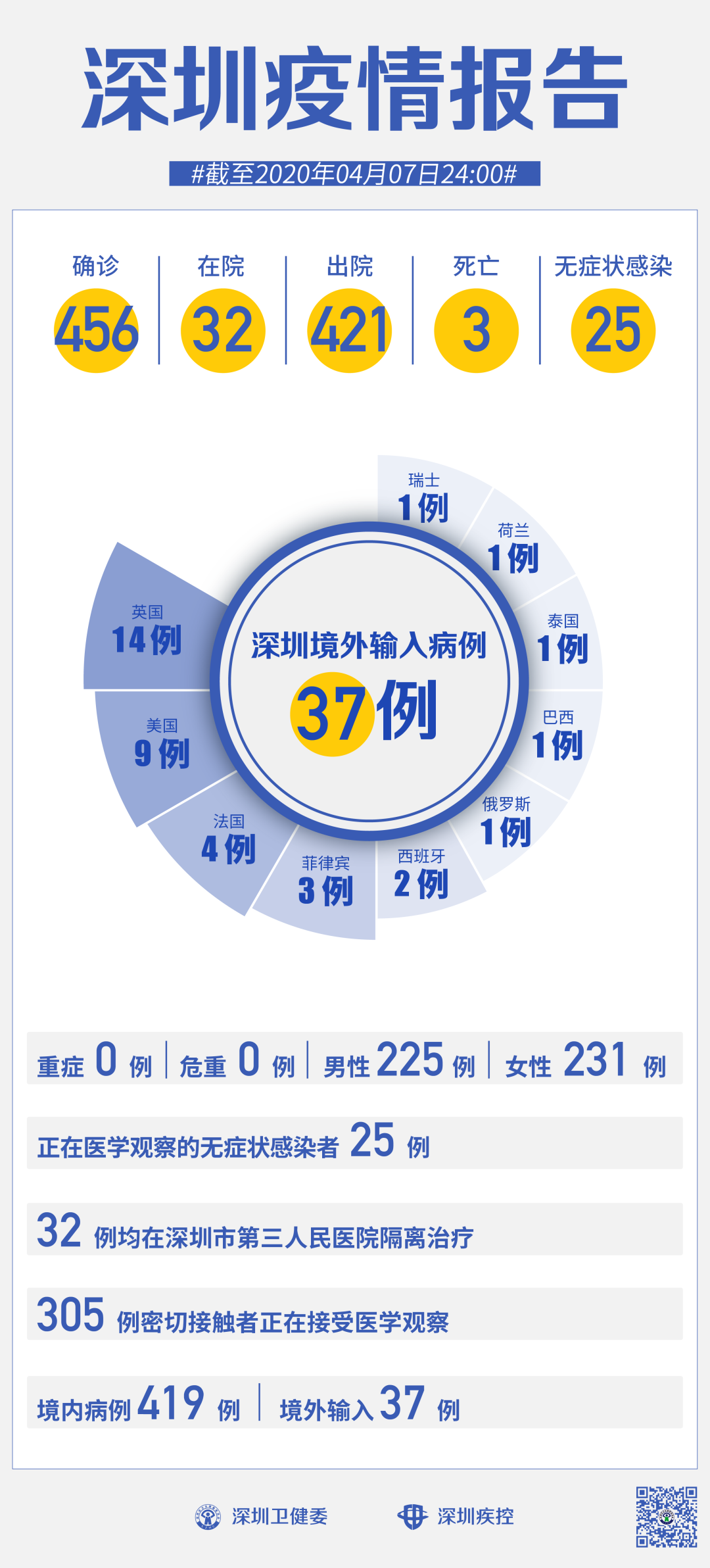 截至4月7日24時(shí),深圳累計(jì)報(bào)告新冠肺炎病例456例。4月7日當(dāng)天新增境外輸入病例1例,新增無(wú)癥狀感染者1例,出院1例。