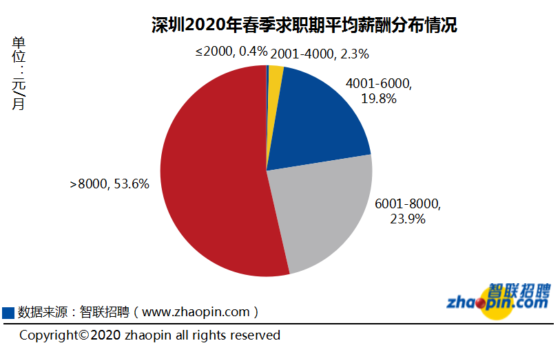 智聯(lián)招聘在線數(shù)據(jù)顯示,深圳地區(qū)2020年春季求職期的平均薪酬為10616元/月,在全國38個主要城市的薪酬水平中排名第三位,薪酬水平較上一季度略有上升,排名沒有變化。從薪酬的分布情況來看,深圳地區(qū)薪酬水平很高,8000元以上/月的職位在職位總量中占比達53.6%,占比較上一季度有所上升,平均月薪6001元/月至8000元/月的占23.9%。