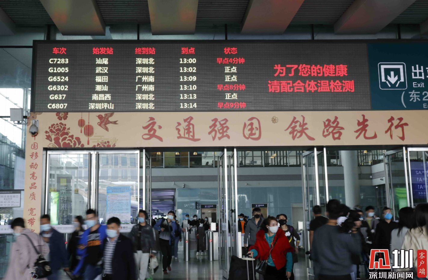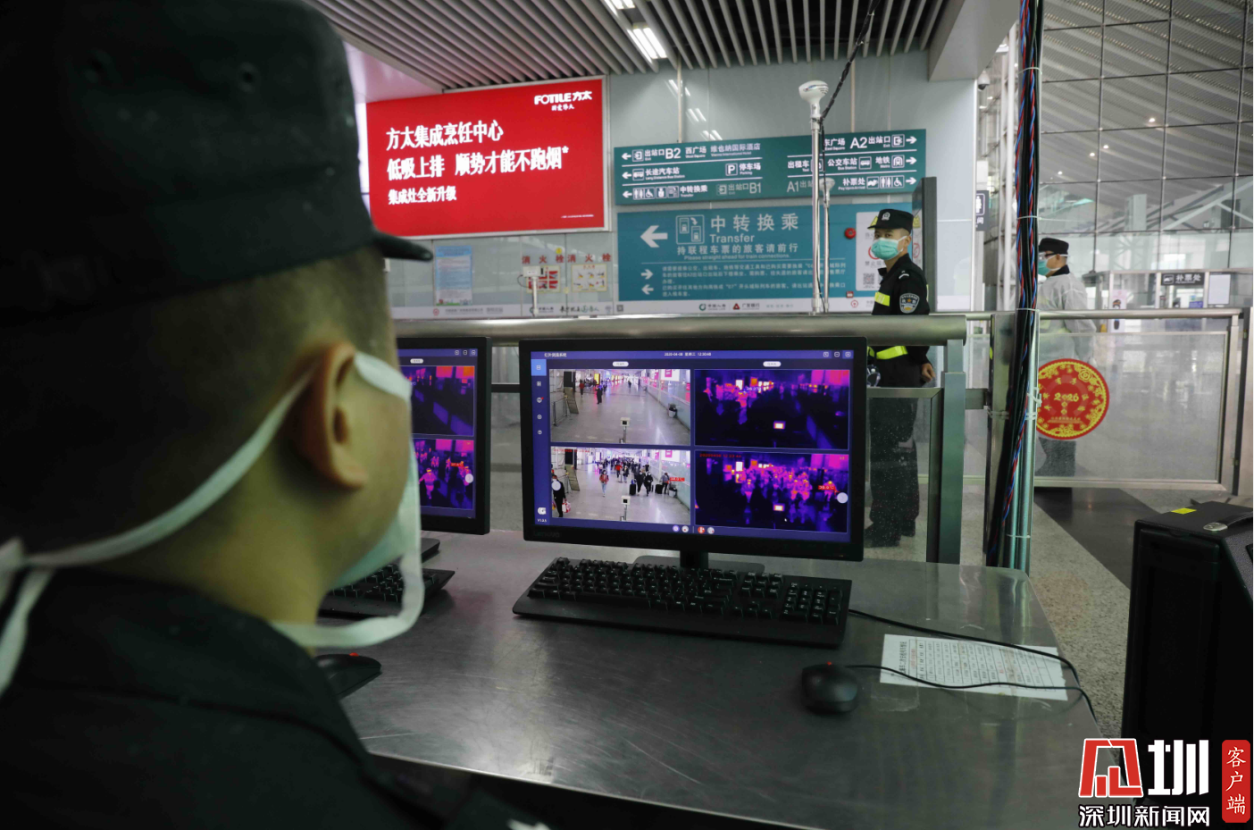 深圳北西廣場(chǎng)出口處,安檢人員正在檢測(cè)旅客體溫。
