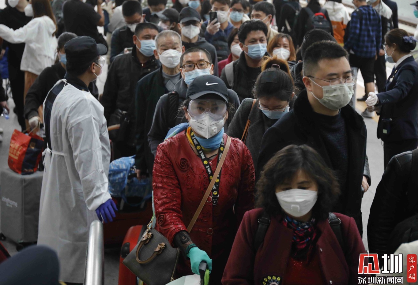 深圳北站西廣場(chǎng)出站口,三位“全副武裝”的旅客。