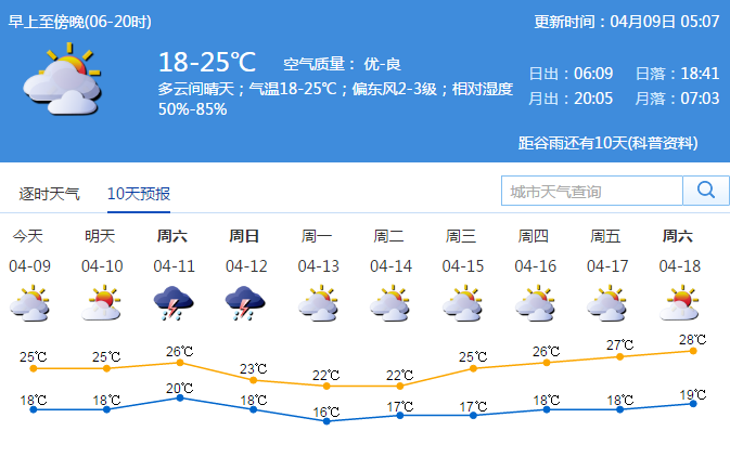 9-10日多云間晴天,氣溫回升;11日午后轉(zhuǎn)雷雨天氣,并伴有短時大風(fēng);12-13日冷空氣影響,氣溫下降3-4℃;展望14-16日多云天氣為主,氣溫逐日回升。