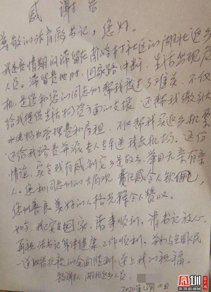 “謝謝你們!”南嶺村這位湖北老鄉(xiāng)返鄉(xiāng)后送來(lái)了感謝信