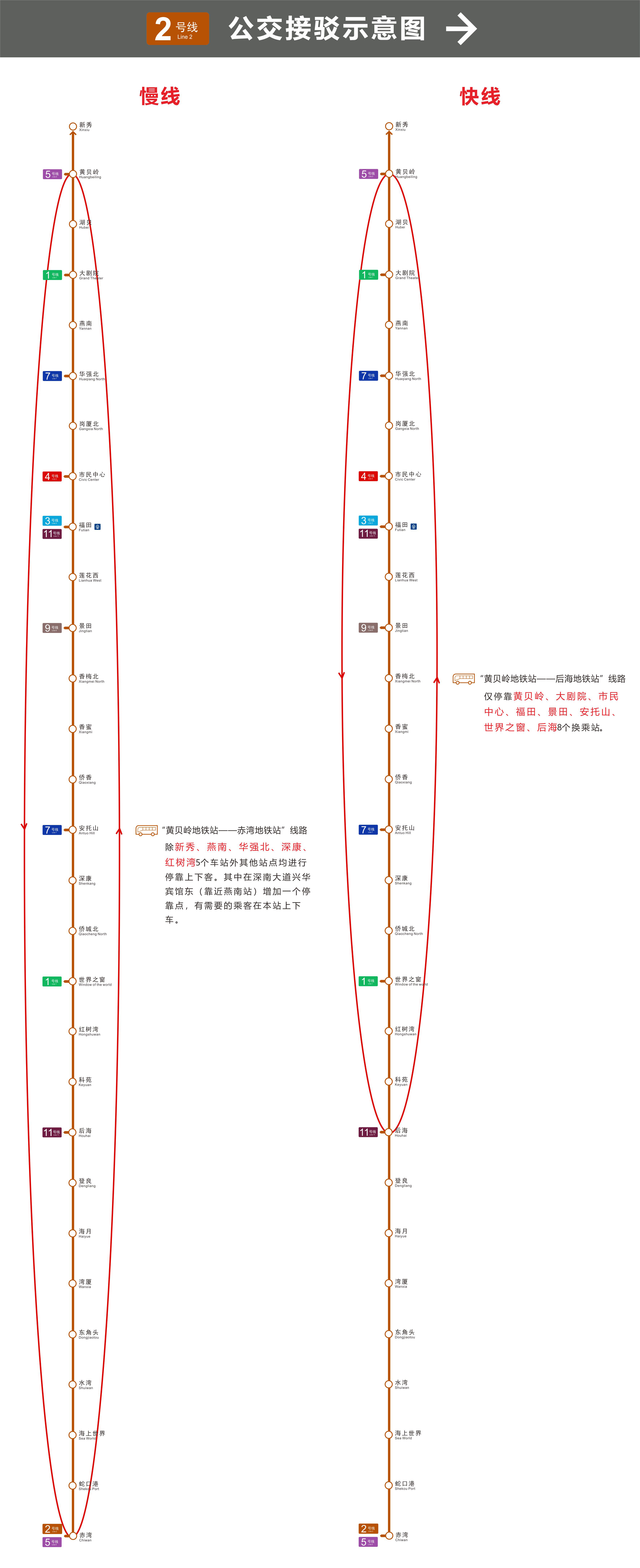 為了方便期間市民乘客的出行,屆時將組織循環(huán)開行2號線的兩條公交接駁線路。1、公交接駁慢線:“黃貝嶺站—赤灣站”。除新秀、燕南、華強北、深康、紅樹灣5個站點不??恐猓溆喔髡揪?可舷驴?。2、公交接駁快線:“黃貝嶺站—后海站”。僅停靠黃貝嶺、大劇院、市民中心、福田、景田、安托山、世界之窗、后海共8個換乘站。