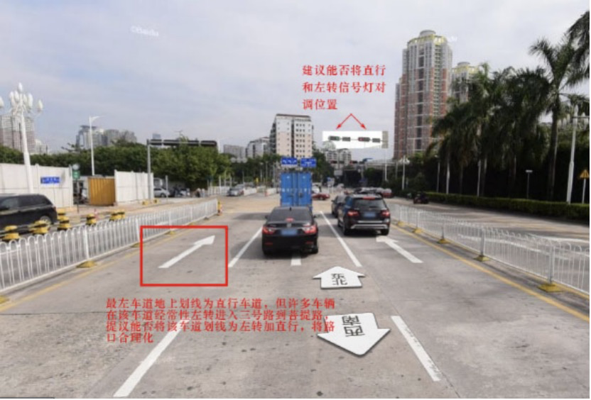 市民建議,桂花路與三號路交叉路口的直行信號燈和左轉(zhuǎn)信號燈對調(diào)位置;同時,桂花路此處的直行最左側(cè)車道可改為左轉(zhuǎn)加直行標(biāo)識。這樣既可以方便社會車輛在此左轉(zhuǎn),又避免有些駕駛員因?yàn)闆]注意到左轉(zhuǎn)信號燈而隨直行車輛左轉(zhuǎn)造成的堵塞或交通事故。