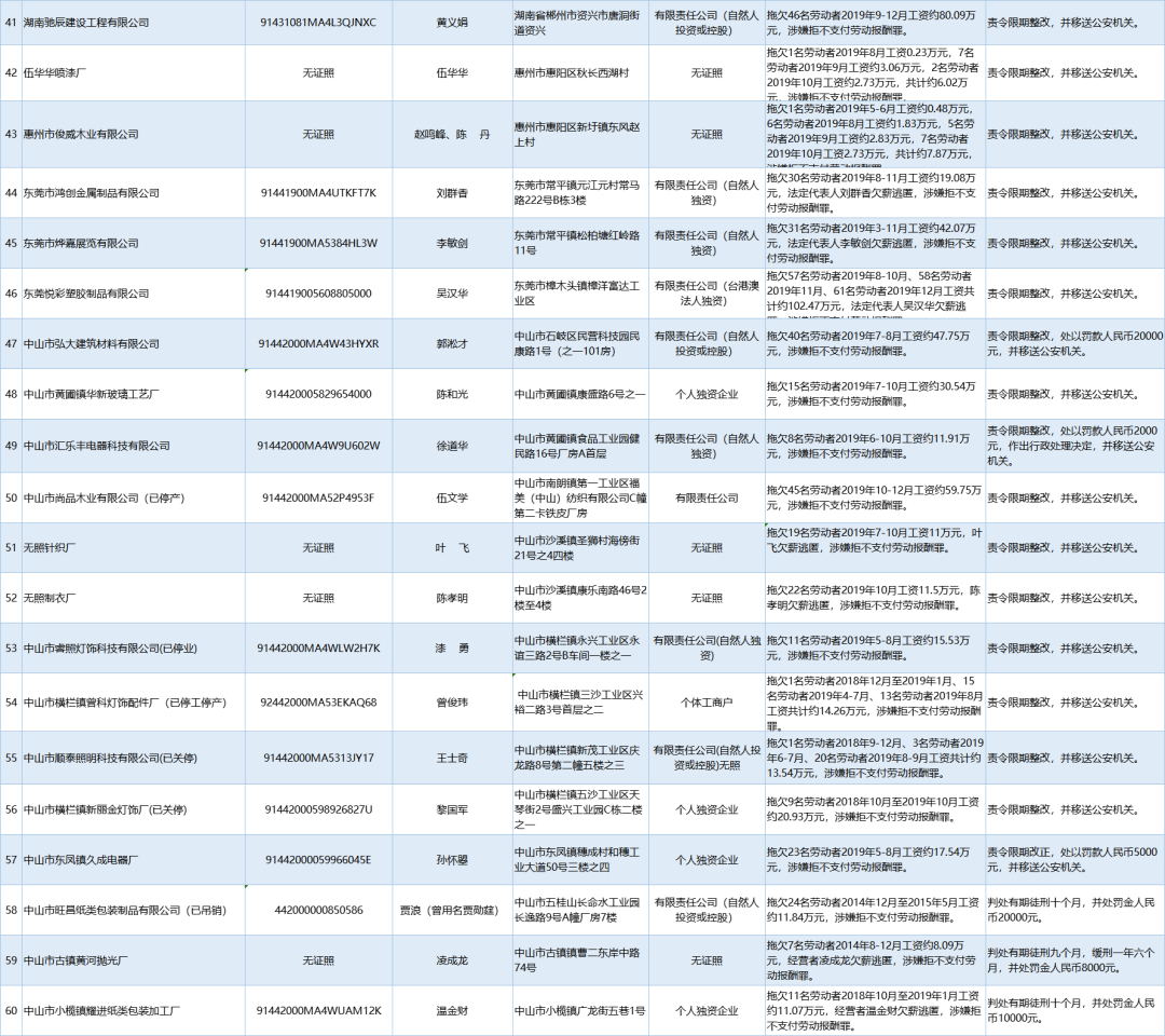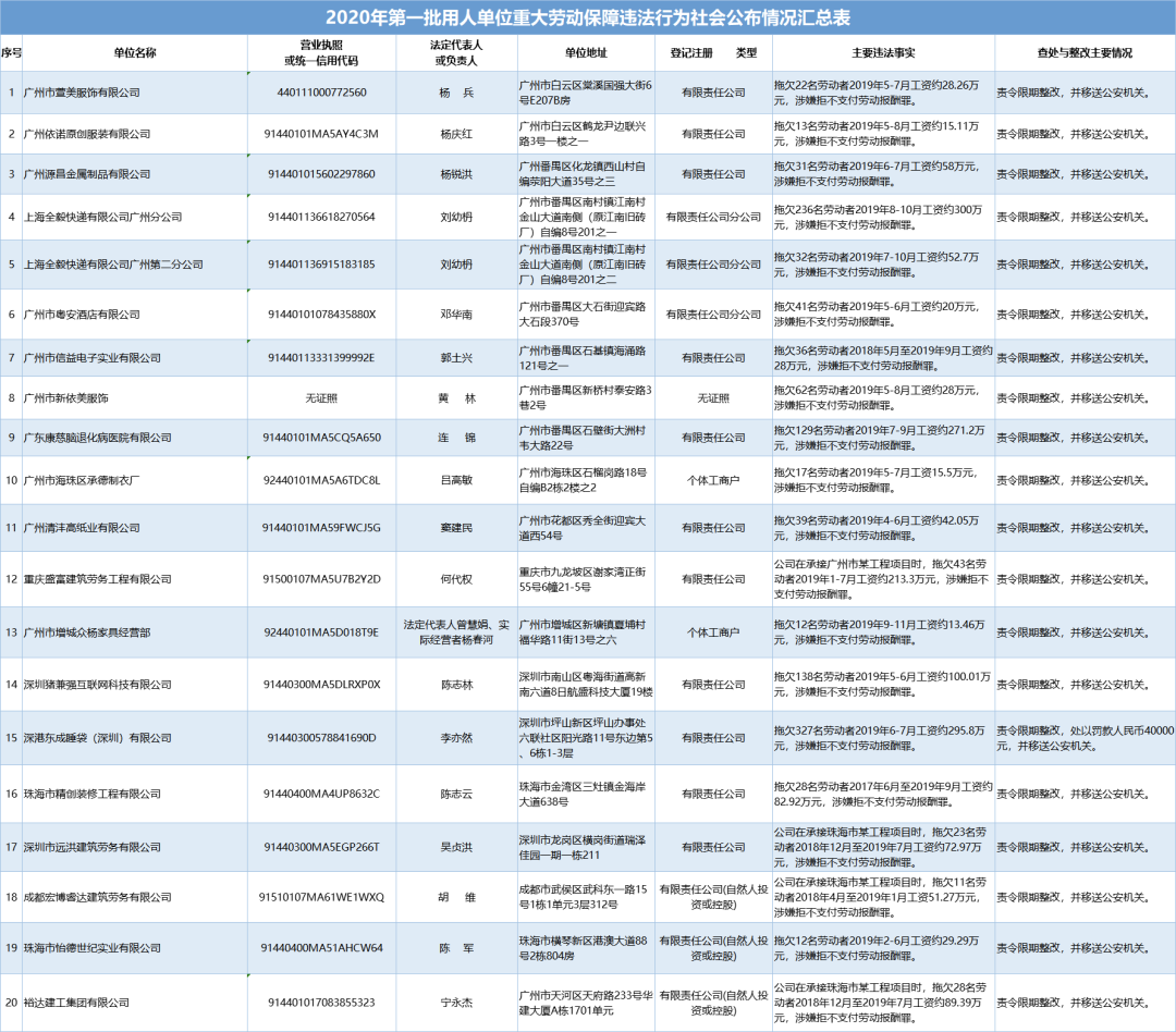 為加強對違法用人單位的社會監(jiān)督,強化誠信體系建設,加大威懾力,依據《廣東省用人單位重大勞動保障違法行為社會公布暫行規(guī)定》,省人社廳公布2020年第一批重大違法案件,涉及81家企業(yè),其中深圳豬兼強互聯網科技有限公司拖欠138名勞動者2019年5-6月工資約100.01萬元,涉嫌拒不支付勞動報酬罪,被責令限期整改,并移送公安機關。深港東成睡袋(深圳)有限公司拖欠327名勞動者2019年6-7月工資約295.8萬元,涉嫌拒不支付勞動報酬罪,被責令限期整改,處以罰款人民幣4萬元,并移送公安機關。