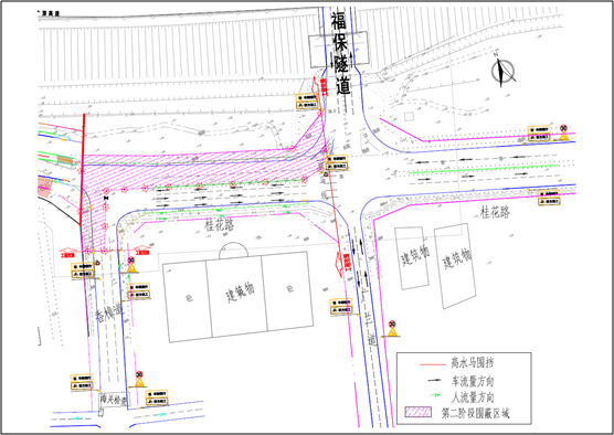 第二階段:對(duì)桂花路(福保隧道-香樟道段)北半幅(靠公園側(cè))進(jìn)行封閉占用施工,南半幅臨時(shí)調(diào)整為三車道,一車道西行(進(jìn)保稅區(qū)方向),兩車道東行(出保稅區(qū)方向)。行人及非機(jī)動(dòng)車輛可通過(guò)南側(cè)人行道通行。本階段預(yù)計(jì)施工時(shí)間為6月20日至8月20日,持續(xù)60天。