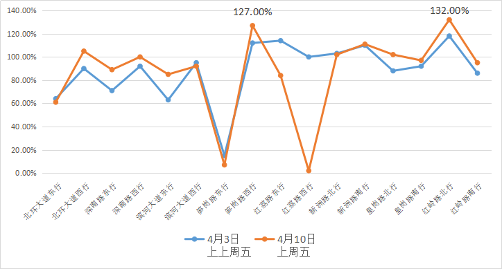 同時(shí),主干道的飽和程度也處于高位。經(jīng)對(duì)上周五和上上周五晚高峰各主干道飽和度情況分析,筍崗路西行和紅嶺路北行飽和度最高,超過(guò)120%。預(yù)計(jì)本周五各主干道飽和度,依然維持較高狀態(tài)。