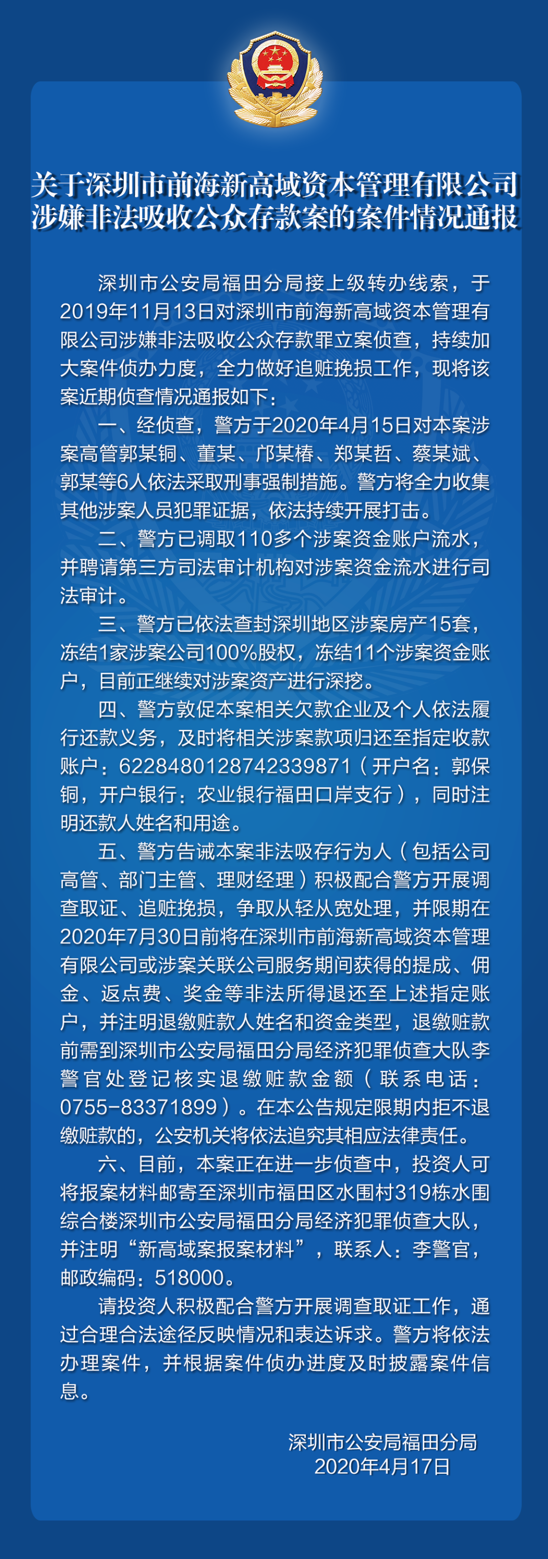 關(guān)于深圳市前海新高域資本管理有限公司涉嫌非法吸收公眾存款案的案件情況通報(bào)