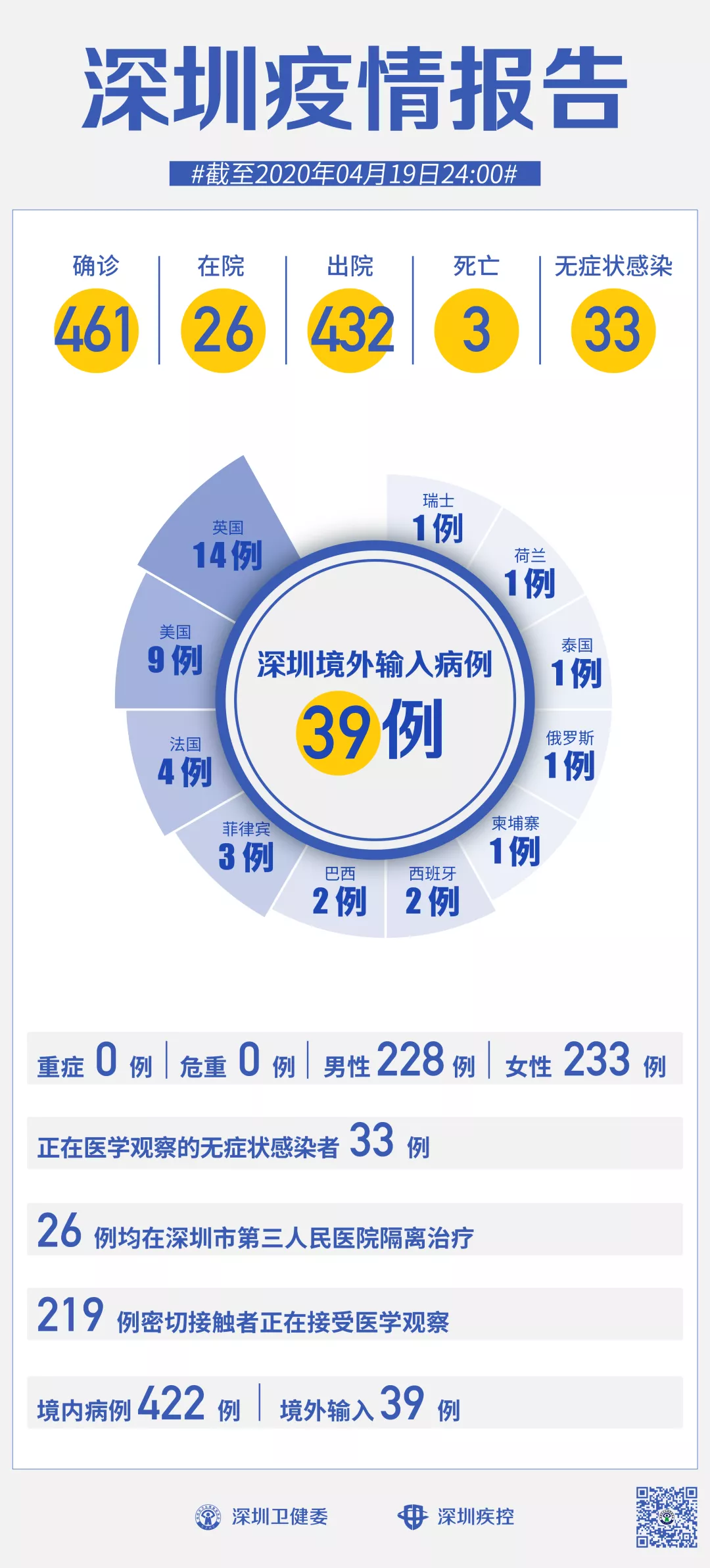 截至4月19日24時,深圳累計報告新冠肺炎病例461例。4月19日當(dāng)天新增無癥狀感染者2例,出院1例。