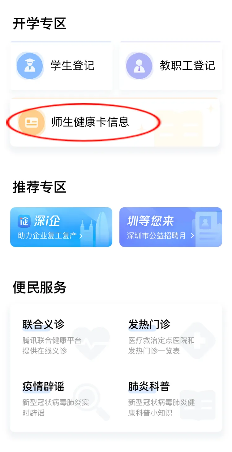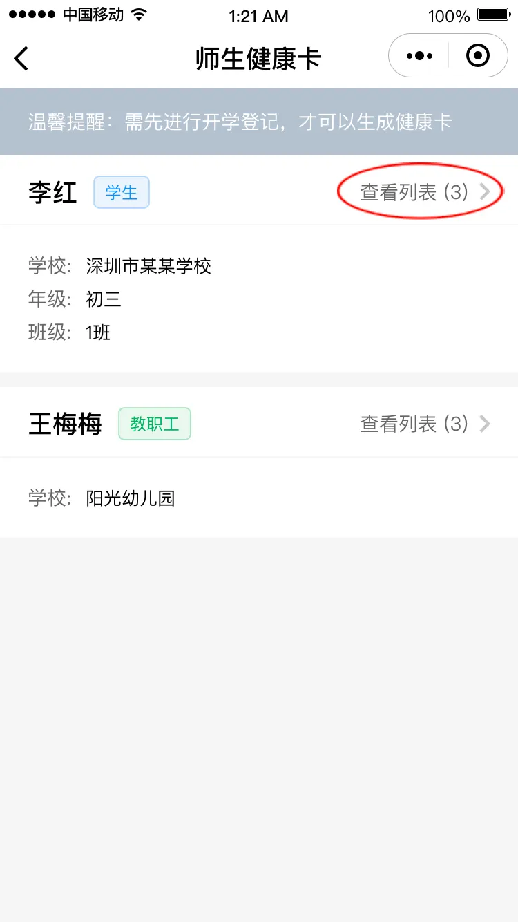 在開學(xué)專區(qū),點擊“師生健康卡信息”,進(jìn)入師生健康卡人員列表。