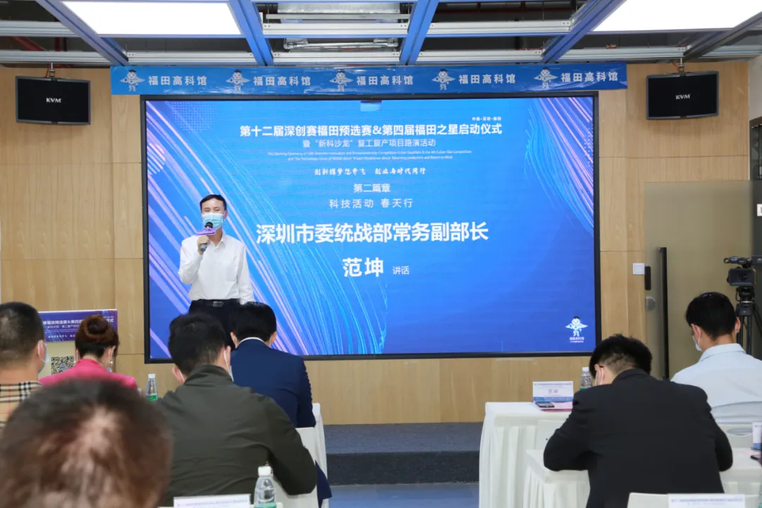 4月23日,由深圳市新聯(lián)會(huì)科技聯(lián)盟、福田高科館主辦的第十二屆深創(chuàng)賽福田預(yù)選賽&第四屆福田之星啟動(dòng)儀式暨“新科沙龍”復(fù)工復(fù)產(chǎn)項(xiàng)目路演活動(dòng)在福田高科館舉行,并進(jìn)行全程網(wǎng)絡(luò)同步直播。深圳市委統(tǒng)戰(zhàn)部常務(wù)副部長(zhǎng)范坤出席活動(dòng)。