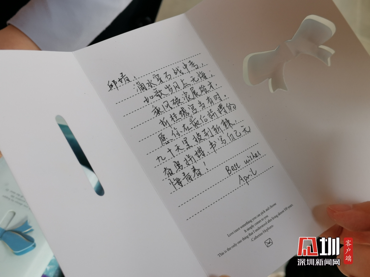 “滴水穿石戰(zhàn)中考,如歌歲月應(yīng)無(wú)悔。乘風(fēng)破浪展雄才,折桂蟾宮當(dāng)有時(shí)。愿你在最后拼搏的九十天里,披荊斬棘,奮勇拼搏,書(shū)寫(xiě)自己無(wú)悔青春。”這是龍華區(qū)外國(guó)語(yǔ)學(xué)校邱婧同學(xué)收到的老師親筆手寫(xiě)的激勵(lì)卡,這些充滿(mǎn)力量的鼓舞詞句表達(dá)了畢業(yè)班園丁們對(duì)學(xué)生們的共同祝福與期盼。