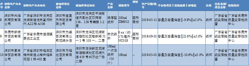 通告顯示,深圳抽檢的3批不合格樣品分別為深圳市寶盈天和百貨有限公司銷售的增厚型紙杯、為盛百貨有限公司觀瀾分店銷售的熱飲紙杯和萬(wàn)福達(dá)百貨有限公司銷售的180ml一次性紙杯(50個(gè)),不合格項(xiàng)目均為容量及容量偏差不符合食品相關(guān)產(chǎn)品安全國(guó)家標(biāo)準(zhǔn)規(guī)定。