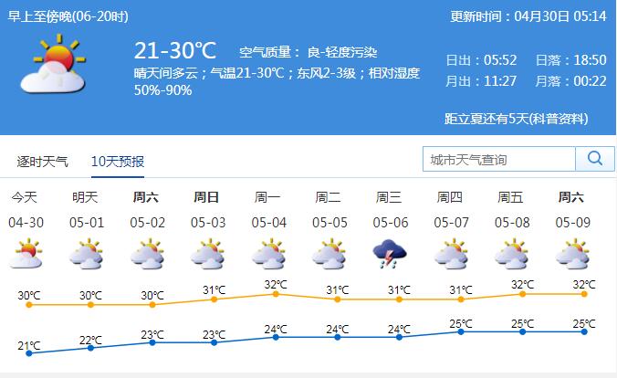 見圳客戶端·深圳新聞網(wǎng)2020年4月30日訊 我市今天晴天間多云,氣溫21-30℃;東風2-3級,相對濕度50%-90%。五一假期期間(5月1-5日)天氣總體平穩(wěn),以多云為主,早晚有輕霧,其中5日前后偶有短時陣雨;假期期間最高氣溫可達31-32℃,中午前后天氣炎熱。森林火險氣象等級較高,要注意用火安全;注意防暑防嗮。