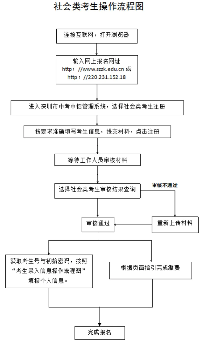 見圳客戶端·深圳新聞網(wǎng)2020年4月30日訊 據(jù)深圳市教育局消息,2020年深圳高中階段學(xué)校招生考試(以下簡稱“中考”)報名定于5月6日-15日進(jìn)行,考試時間為7月20日-21日。 今年本市應(yīng)屆初中畢業(yè)生仍繼續(xù)在就讀學(xué)校集體辦理報名手續(xù)。符合深圳中考報名條件的深圳戶籍往屆生、在市外就讀的深圳戶籍應(yīng)屆初中畢業(yè)生(以下簡稱“社會類考生”)采用網(wǎng)上報名方式進(jìn)行報名。 報名條件 一、具有我市戶籍的初中畢業(yè)生,可以在我市報名參加中考。 二、具有我市初三學(xué)籍的隨遷子女可以報名參加中考,同時符合以下條件的,可以參加相應(yīng)的公辦普高、民辦普高和中職學(xué)校的劃線錄取。 (一)父親或母親在我市具有合法穩(wěn)定職業(yè); (二)父親或母親在我市具有合法穩(wěn)定住所; (三)父親或母親持有有效《深圳經(jīng)濟(jì)特區(qū)居住證》; (四)父親或母親在我市繳納基本養(yǎng)老保險及基本醫(yī)療保險,且至少其中一個險種累計繳費(fèi)滿3年,社保累計年限計算截至2020年8月31日; (五)隨遷子女在我市具有3年完整初中學(xué)籍。 不符合上述條件但具有我市初中學(xué)籍的隨遷子女,可以在我市參加中考,但僅限于參加民辦普高補(bǔ)錄或中職學(xué)校注冊入學(xué)。 三、高中階段學(xué)校在校生不得報名。 本市應(yīng)屆初中畢業(yè)生報名辦法 本市應(yīng)屆初中畢業(yè)生于5月6日至7日在就讀學(xué)校集體辦理報名手續(xù)。 今年中考繼續(xù)實(shí)行網(wǎng)上報名。要求各學(xué)校開放計算機(jī)房,為本??忌暇W(wǎng)報名提供方便。 5月8日至15日,學(xué)校組織考生進(jìn)行電子攝像,學(xué)校和考生分別上網(wǎng)錄入報名信息,考生錄入信息可參考“考生錄入信息流程圖”進(jìn)行操作。 市教育局強(qiáng)調(diào),學(xué)校不得以任何理由拒絕有本校學(xué)籍的應(yīng)屆畢業(yè)生報考(參加中職學(xué)校自主招生、注冊入學(xué)的考生,也須報名參加中考)。如有違反者,將嚴(yán)肅查處,并追究相關(guān)人員責(zé)任。同時要求各區(qū)有關(guān)職能部門、各有關(guān)學(xué)校(報名點(diǎn))要嚴(yán)格審查報名材料。對不符合報名條件、弄虛作假而被錄取的考生,一經(jīng)發(fā)現(xiàn),取消其錄取資格;已經(jīng)到錄取學(xué)校報到注冊的,取消其學(xué)籍,并追究相關(guān)人員責(zé)任。 社會類考生報名辦法 社會類考生采用網(wǎng)上報名方式進(jìn)行報名。報名考生需在5月6日至15日登錄報名網(wǎng)址(http://www.szzk.edu.cn/),按照提示進(jìn)行網(wǎng)上注冊,上傳報名審核資料,由考生戶籍所在區(qū)社會報名點(diǎn)進(jìn)行線上審核,審核通過后系統(tǒng)將生成中考考生號及初始密碼,考生需用獲取的考號及密碼登錄中考中招管理系統(tǒng),填寫個人信息,具體操作可參考“考生錄入信息流程圖”。同時需在報名截止前根據(jù)指引完成網(wǎng)上繳費(fèi)。 若考生網(wǎng)上報名審核不通過,需按照系統(tǒng)的不通過原因提示,重新補(bǔ)充審核資料,如多次上傳資料失敗或?qū)徍瞬煌ㄟ^,考生可撥打戶籍所在區(qū)的社會報名點(diǎn)電話進(jìn)行咨詢或電話預(yù)約,按照工作人員指示進(jìn)行操作報名,不要在未預(yù)約的情況下前往社會報名點(diǎn),盡量避免出行,減少人員聚集。 社會類考生操作流程如下圖: