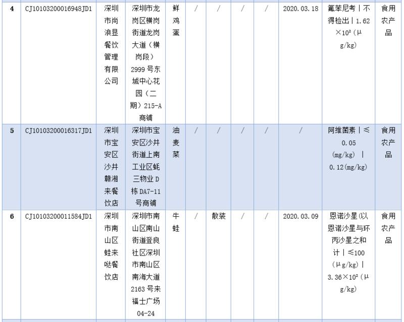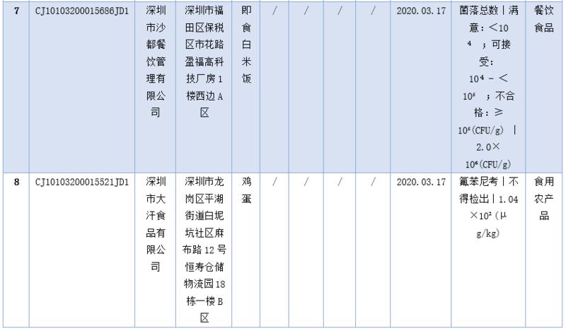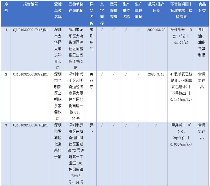 見圳客戶端·深圳新聞網(wǎng)2020年5月1日訊(深圳特區(qū)報(bào)記者 楊德琦)4月30日,深圳市市場監(jiān)督管理局發(fā)布第十四期食品安全抽樣檢驗(yàn)情況通報(bào),3月共抽檢餐飲環(huán)節(jié)食品1009批次,涉及餐飲環(huán)節(jié)經(jīng)營主體919家次,共檢測食品指標(biāo)6347項(xiàng)次。其中不合格樣品8批次,涉及不合格食品類別有食用農(nóng)產(chǎn)品6批次,黃豆芽、蘿卜、雞蛋、油麥菜、牛蛙等在列;餐飲食品1批次,為即食白米飯;食用油、油脂及其制品1批次,為煎炸用油。涉及不合格項(xiàng)目類別為獸藥殘留、農(nóng)藥殘留、非食用物質(zhì)、微生物污染、品質(zhì)指標(biāo)。
