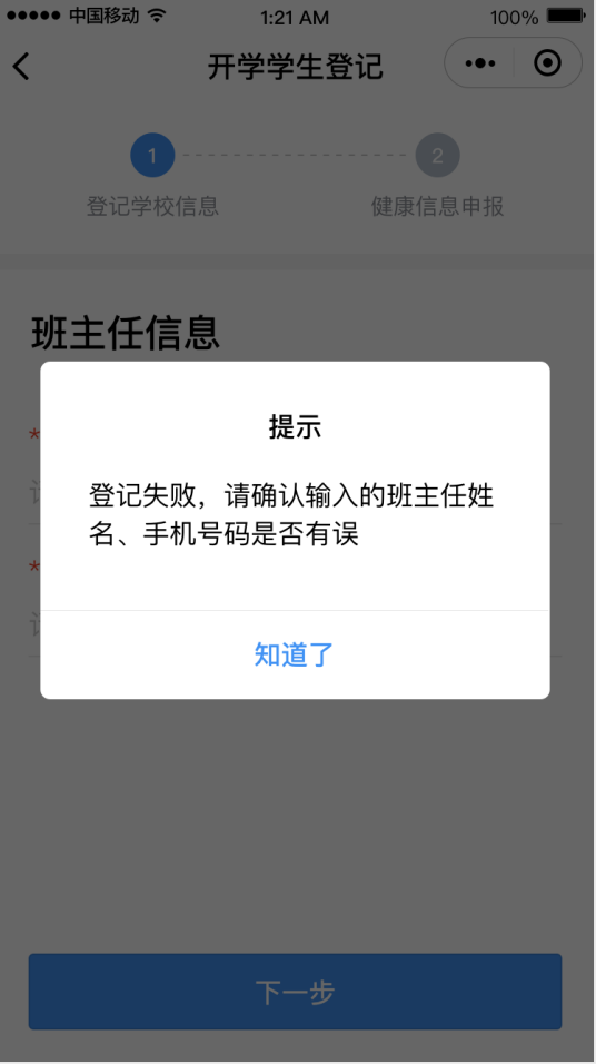 ②進入“學(xué)生登記”頁面,點擊“馬上登記”按鈕,填寫班主任姓名和手機號碼后點擊“下一步”,然后選擇對應(yīng)的班級,進入健康申報卡界面。