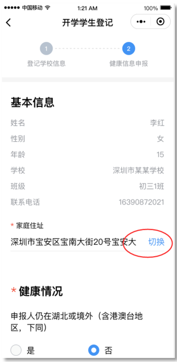 ③完成健康信息申報,包括選擇家庭住址、申報健康情況、填寫監(jiān)護人姓名等,請勾選申報承諾,點擊“生成師生健康碼”即可完成健康申報。