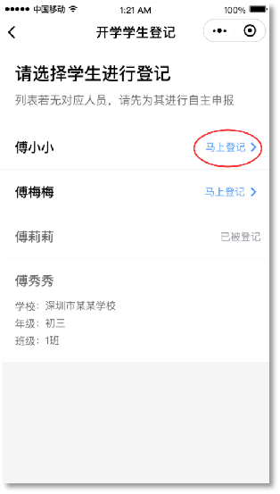 ③完成后進入“開學(xué)學(xué)生登記”頁面,選擇學(xué)生名字旁邊的“馬上登記”,填寫班主任姓名和手機號碼后點擊“下一步”。