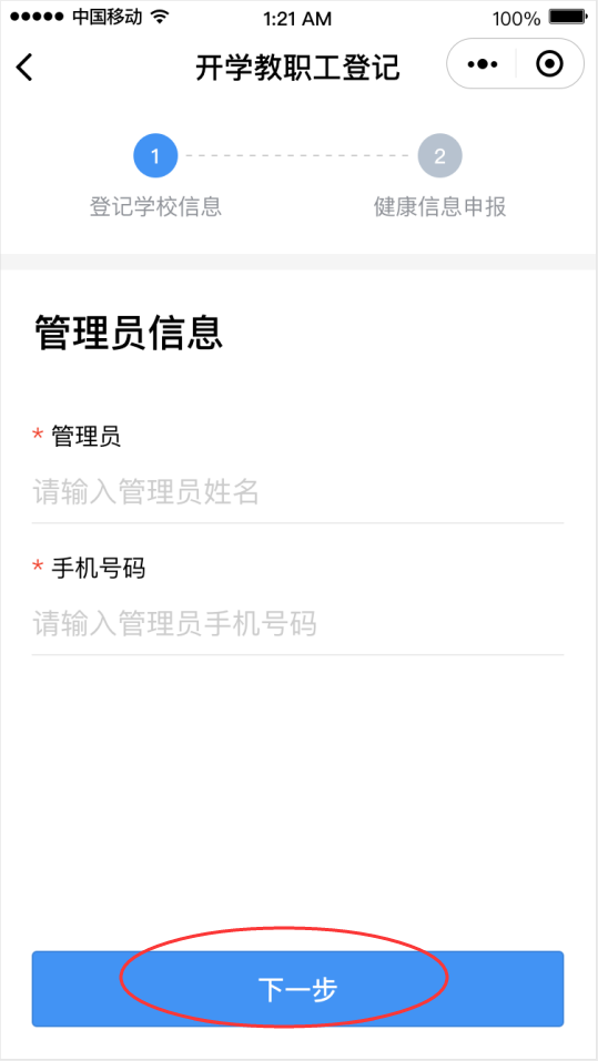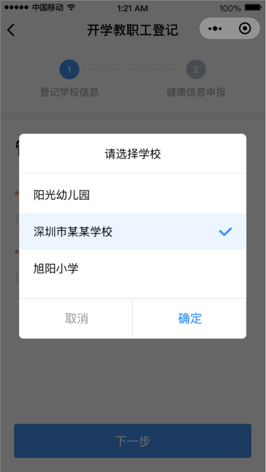 ②點擊“馬上登記”按鈕,填寫學(xué)校管理員姓名和手機(jī)號碼(學(xué)校管理員姓名和手機(jī)號碼請詢問學(xué)校獲得)后點擊“下一步”,然后選擇對應(yīng)的學(xué)校。
