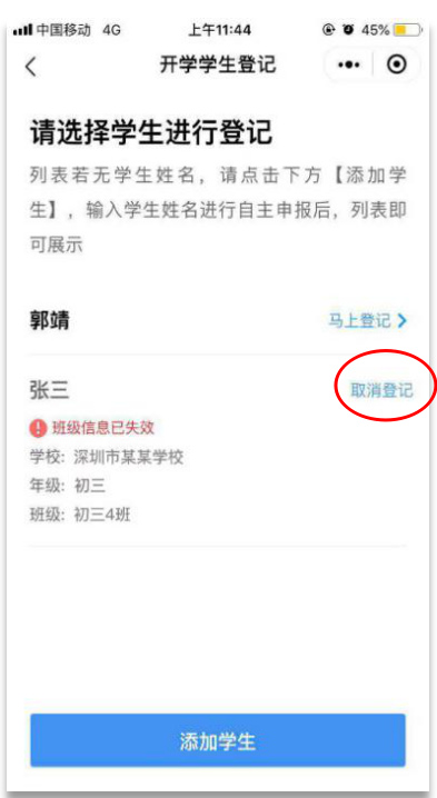 對(duì)于已完成開(kāi)學(xué)登記的師生,如開(kāi)學(xué)登記頁(yè)面顯示學(xué)校信息或班級(jí)信息已失效,或選錯(cuò)登記人員時(shí),請(qǐng)取消此條登記記錄,重新進(jìn)行開(kāi)學(xué)登記。取消成功后,原申報(bào)的師生健康卡信息將會(huì)失效。以下操作步驟以學(xué)生登記為例,具體如下: