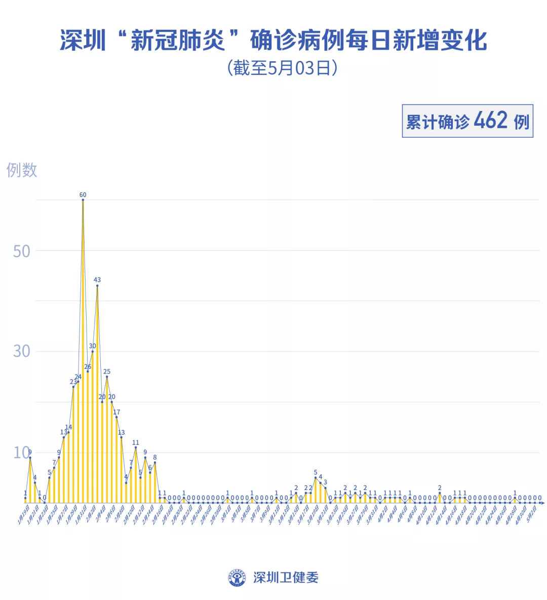 截至5月3日24時,深圳累計報告新冠肺炎病例462例。5月3日當天新增出院1例。