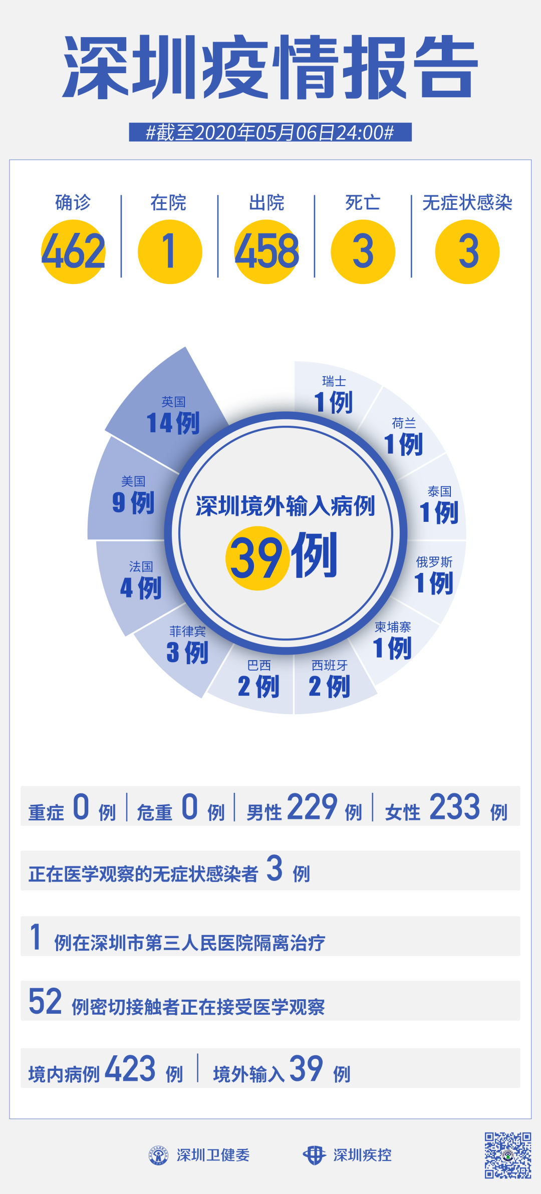 截至5月6日24時,深圳累計(jì)報(bào)告新冠肺炎病例462例。在院治療僅有1例。