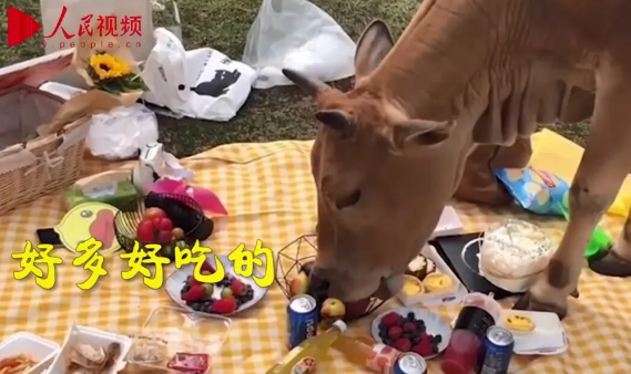 最近福建福清的幾位同學(xué)吭哧吭哧爬了一個(gè)小時(shí)的山,在草地上剛鋪好餐布擺完食物,正準(zhǔn)備拍照時(shí),來(lái)了一頭?!?/p>