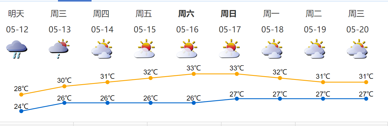 12日有雷陣雨,局部大雨,局部有短時(shí)陣雨;13日陣雨轉(zhuǎn)多云;14-17日多云到晴天,天氣再趨悶熱。