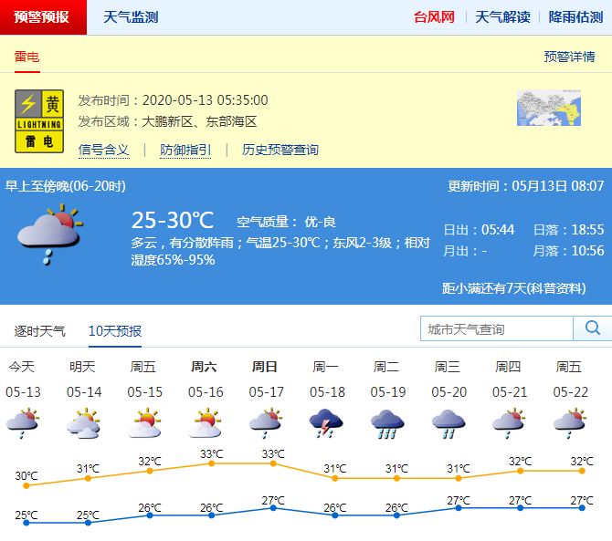 預計13日多云間陰天,氣溫24-29℃;14-17日多云到晴天,局部偶有短時陣雨或雷陣雨,最高氣溫可達32-33℃,天氣漸趨悶熱;展望18-19日有一次明顯降雨過程。
