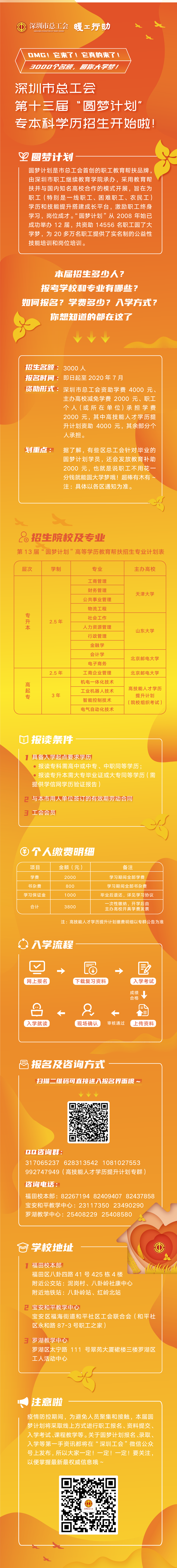 在疫情防控、復工復產的特殊形勢下,結合市總工會“暖工行動”相關要求,本屆“圓夢計劃”進一步提高幫扶精準性,向受疫情影響嚴重的企業(yè)和職工傾斜,推動企業(yè)和職工共擔責任、共克時艱,穩(wěn)定職工隊伍和就業(yè),努力做到職工多轉崗、少下崗、多就業(yè)、少失業(yè)。符合報名條件的職工可在“深圳工會”微信公眾號上進行報名,報名截止日期為7月30日,主辦方將根據報名人數(shù)分期分批組織入學考試。入學考試采用“文化素養(yǎng)+職業(yè)技能+工作實績”的多元評價方式,在“文化素養(yǎng)”為主體考試中增加工會基本知識,提高職工工會意識。所有錄取學員將于今年9月入學就讀,進行線上線下相結合的學習,在規(guī)定學制內修滿學分將獲得各高校頒發(fā)、國家承認的畢業(yè)證書。
