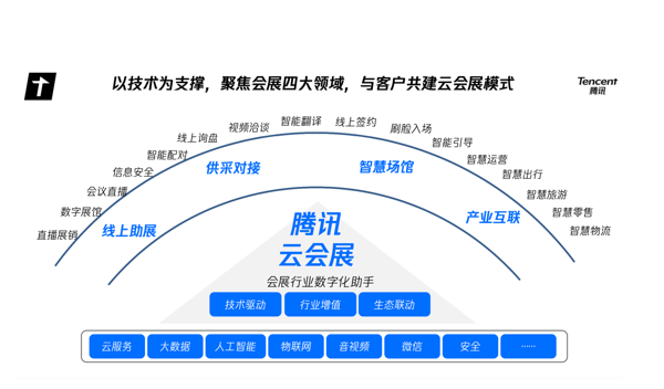 伴隨著云計算、5G、AI、大數(shù)據(jù)等技術(shù)的成熟,騰訊已經(jīng)成為多個大型會展項(xiàng)目提供產(chǎn)品和技術(shù)服務(wù),不斷實(shí)踐和探索線上線下融合的產(chǎn)品技術(shù)及綜合解決方案。騰訊云會展打造的有別于實(shí)體觀展模式的新思路和新玩法,包括線上展覽、智慧展會、云展覽等形式,也正為各級政府和企業(yè)激活云上經(jīng)濟(jì)注入新動能。
