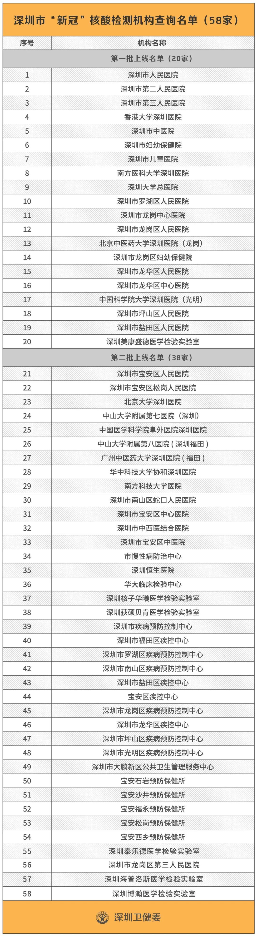 目前,深圳共有58家機(jī)構(gòu)開(kāi)展新冠病毒核酸檢測(cè),包括35家醫(yī)院、16家公共衛(wèi)生機(jī)構(gòu)和7家第三方檢測(cè)機(jī)構(gòu)。