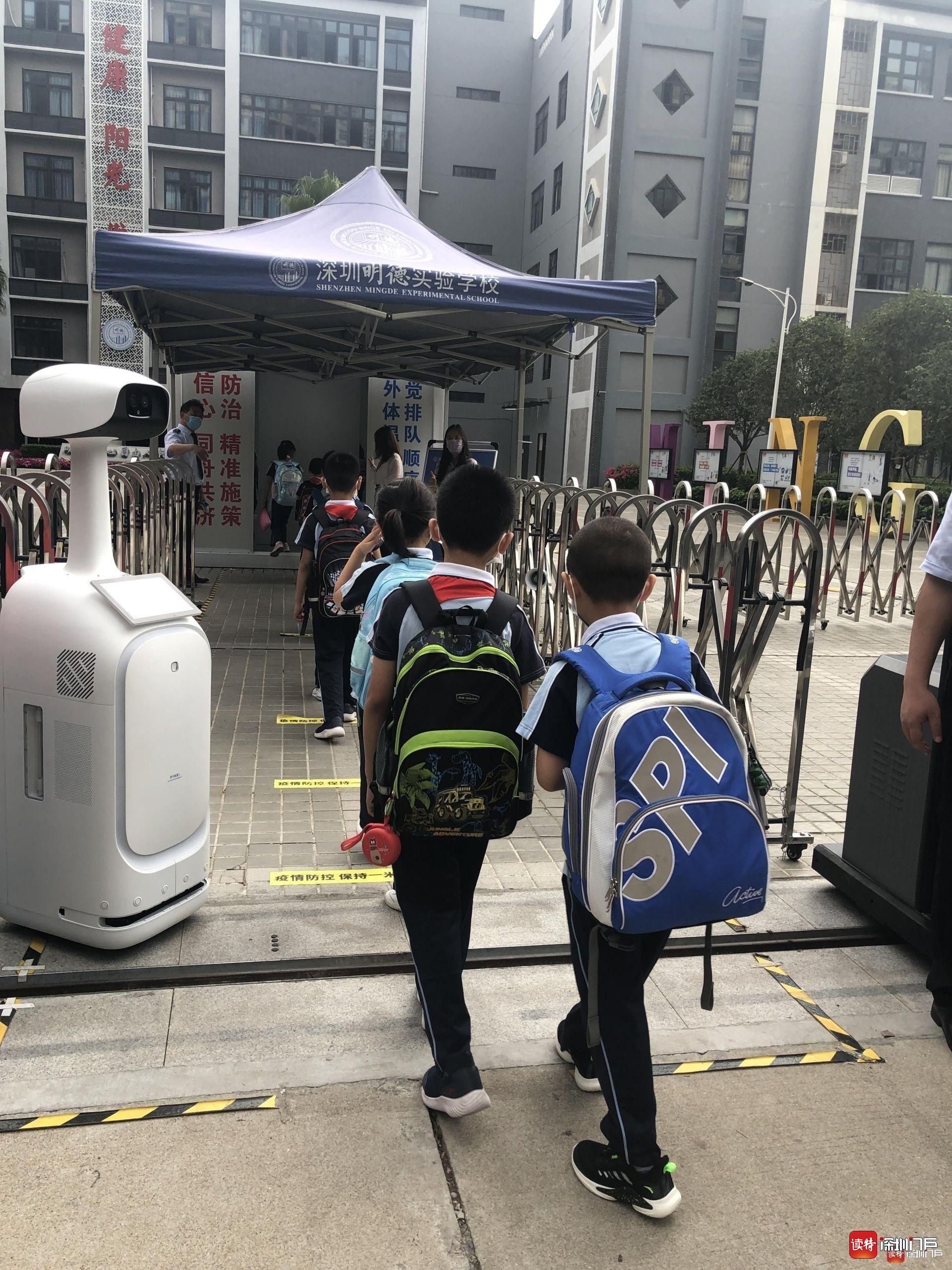 “同學(xué)們好!”“歡迎回來!”從7點(diǎn)起,明德實(shí)驗(yàn)學(xué)校校長魯江與工作人員就在香蜜校區(qū)校門口迎候?qū)W生們,提醒孩子們戴好口罩,也與家長們交流返校事宜。校門口的一臺(tái)超氧水消殺機(jī)器人也在積極投入工作,工作人員在后臺(tái)控制面板可以監(jiān)測到入校人員的體溫情況。
