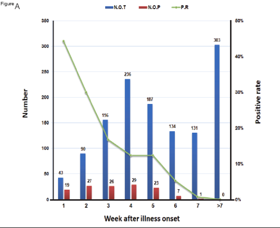 患者糞便中 SARS-CoV-2在病程不同時(shí)間(周)的檢測(cè)情況。