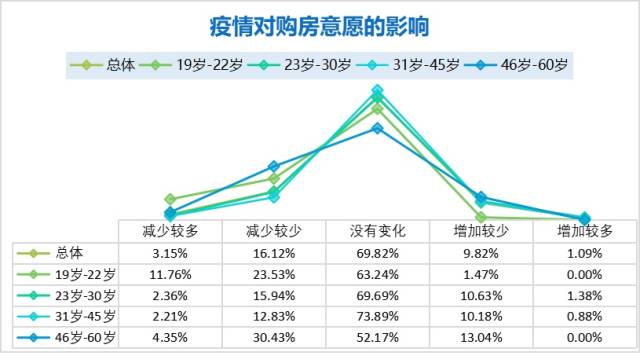 通過(guò)對(duì)不同年齡段消費(fèi)者的購(gòu)房、購(gòu)車意愿調(diào)研發(fā)現(xiàn),19-22歲及46-60歲的受訪者因疫情影響購(gòu)房、購(gòu)車意愿變化相對(duì)較大,意愿減少人數(shù)占比較多。