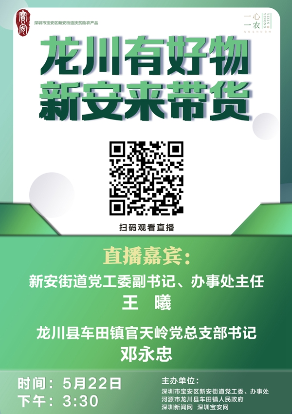 5月22日下午3:30,新安街道黨工委副書記、辦事處主任王曦、龍川縣車田鎮(zhèn)官天嶺村支部書記鄧永忠還將作客深圳新聞網(wǎng)直播間,向網(wǎng)友推介綠殼雞蛋、黑豆腐竹、生態(tài)米、牛?;ㄉ葍?yōu)質(zhì)農(nóng)產(chǎn)品,通過電商打通貧困村農(nóng)產(chǎn)品銷售渠道。歡迎觀看,不見不散!