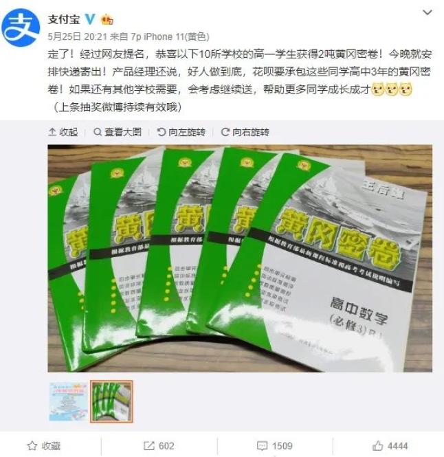 前段時(shí)間,支付寶發(fā)布了學(xué)雜費(fèi)支持分期的微博,評(píng)論里有家長在呼喚學(xué)習(xí)資料,所以花唄產(chǎn)品經(jīng)理決定除了學(xué)雜費(fèi)分期,再買2噸黃岡密卷送人。