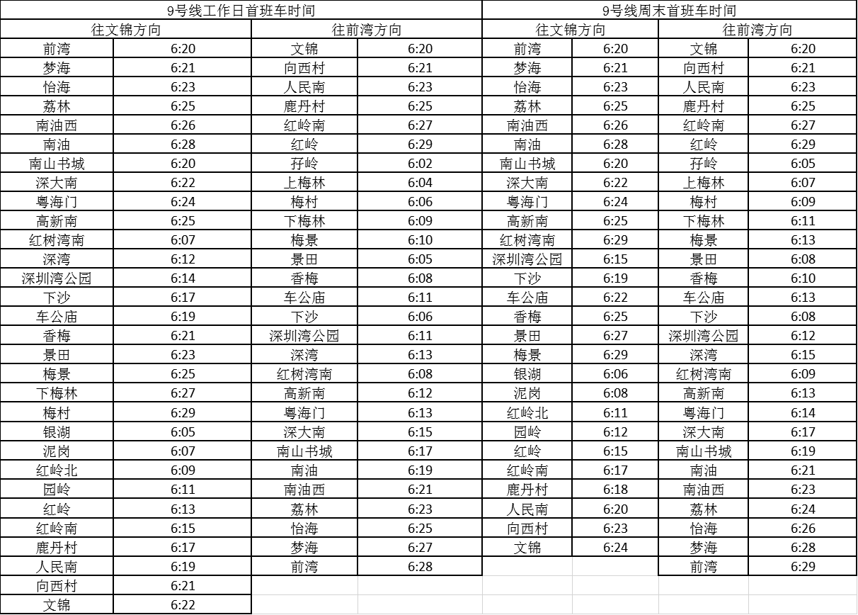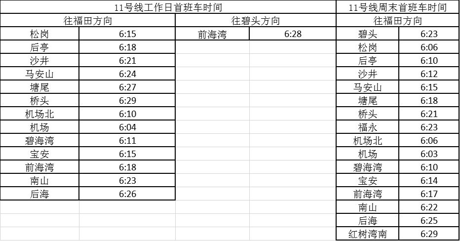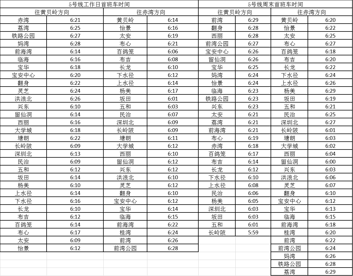 記者獲悉,經(jīng)優(yōu)化調(diào)整后,各線路工作日首班車(chē)最早發(fā)車(chē)站點(diǎn)及時(shí)間分別為,1號(hào)線老街站6:29、2號(hào)線蛇口港站6:14、3號(hào)線塘坑站6:05、5號(hào)線坂田站6:01、7號(hào)線赤尾6:09、9號(hào)線銀湖6:05、11號(hào)線機(jī)場(chǎng)站6:04。周末期間首班車(chē)最早發(fā)車(chē)站點(diǎn)及時(shí)間分別為,2號(hào)線香梅北站6:07、3號(hào)線塘坑站6:04、5號(hào)線長(zhǎng)嶺陂站6:00、7號(hào)線皇崗口岸站6:09、9號(hào)線孖嶺站6:05、11號(hào)線機(jī)場(chǎng)站6:03。