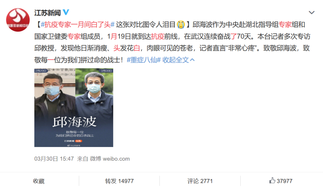 這是此前因“一月白頭”被網(wǎng)友熟知的國(guó)家衛(wèi)健委救治專家組成員、東南大學(xué)附屬中大醫(yī)院副院長(zhǎng)邱海波。