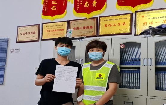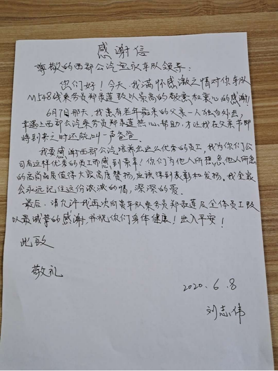 見圳客戶端·深圳新聞網(wǎng)2020年6月9日訊(深圳特區(qū)報記者 徐興東)6月9日早上,一位自稱劉先生的年輕人冒著滂沱大雨來到了西部公汽寶永車隊。一進(jìn)辦公室,劉先生雙手捧著將親筆寫的一封感謝信呈給了隊助張喜鳳,并深有感觸地說道:“多災(zāi)多難的父親有幸遇到乘務(wù)員鄭錄蓮的熱心幫助,并想方設(shè)法聯(lián)系上我。謝謝你們的成全,才讓我在父親節(jié)即將到來之時還能叫一聲爸爸,我將終生銘記諸位的大恩大德!”樸實無華的話語,感染了在場的每一個人,分明看出個個眼里都閃爍著晶瑩的喜悅淚花。