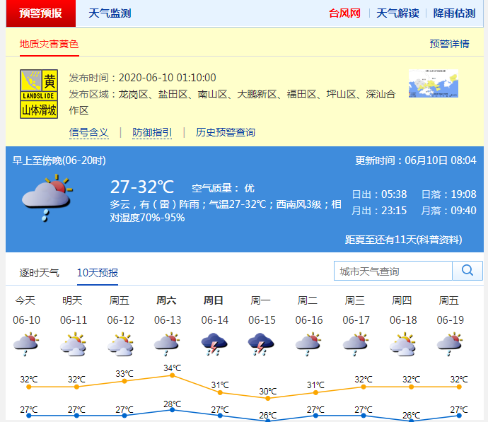市氣象臺預測,10日我市(含深汕)多云,有短時(雷)陣雨,局部大雨,本輪“龍舟水”過程趨于結束。11-13日多云,有短時(雷)陣雨,天氣漸趨悶熱。