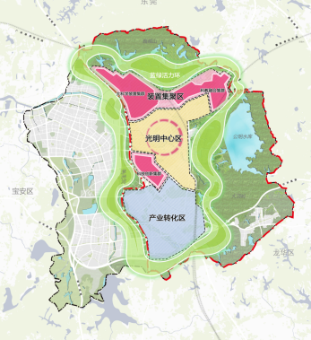 北部裝置集聚區(qū),營(yíng)造嵌山擁湖、綠蔭環(huán)繞的“科學(xué)山林”總體風(fēng)貌。中部光明中心區(qū),形成中央公園與垂直城市錯(cuò)落有致的“樂活城區(qū)”風(fēng)貌。南部產(chǎn)業(yè)轉(zhuǎn)化區(qū),塑造富有生態(tài)內(nèi)涵和科技文化氛圍的“共享智谷”風(fēng)貌。