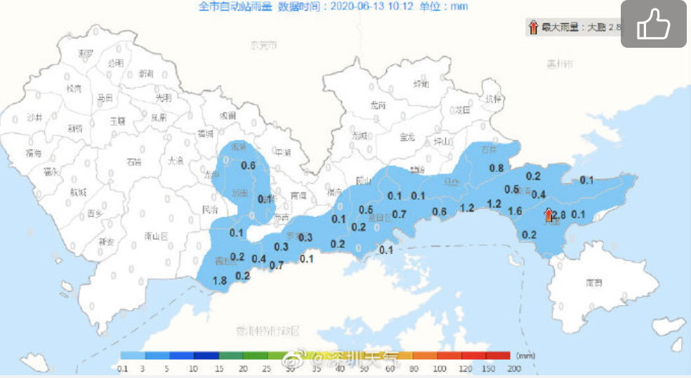 降雨云團正在往西北方向移動,預計將會影響龍華、光明和寶安北部區(qū)域。