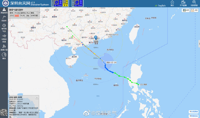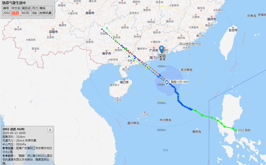 6月13日12時臺風“鸚鵡”(熱帶風暴級)位于深圳市東南方大約446公里的海面上,中心附近最大風力8級。未來24小時趨向江門至茂名附近海域,最大可能在陽江附近登陸。我市13日17時前后起風力逐漸加大,13日夜間至14日上午為風雨主要影響時段。目前臺風藍色預警信號生效中。深圳市氣象臺2020年06月13日12時35分發(fā)布。