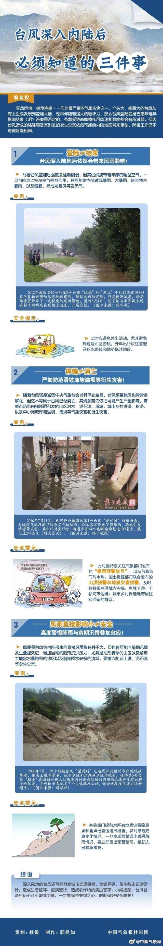 3、風雨直接影響小不等于安全。即便臺風給內陸帶來的直接風雨影響不大,但可能與前期汛情疊加,產(chǎn)生泥石流等次生災害。