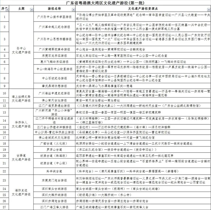 ⑦13日,首批粵港澳大灣區(qū)文化遺產(chǎn)游徑發(fā)布,包含孫中山文化遺產(chǎn)游徑、海上絲綢之路文化遺產(chǎn)游徑、華僑華人文化遺產(chǎn)游徑、古驛道文化遺產(chǎn)游徑和海防史跡文化遺產(chǎn)游徑五大主題共27段實體游徑。其中,海防史跡文化遺產(chǎn)游徑主要分布于東莞、深圳,包括深圳南頭古城游徑、大鵬所城游徑、赤灣炮臺游徑等。