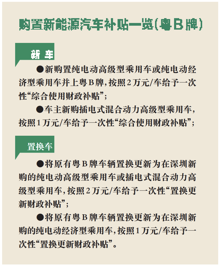 ⑥近日,市發(fā)改委發(fā)布《深圳市應(yīng)對新冠肺炎疫情影響促進(jìn)新能源汽車推廣應(yīng)用若干措施財政補貼申領(lǐng)工作指引》,將原有粵B牌車輛置換更新為在深圳市新購的新能源小汽車并上粵B牌的個人消費者,最高可享受一次性財政補貼4萬元。市生態(tài)環(huán)境局再次發(fā)布溫馨提示,我市老舊車提前淘汰獎勵補貼政策將于6月30日截止,請車主抓緊時間淘汰車輛,逾期將不能享受補貼。
