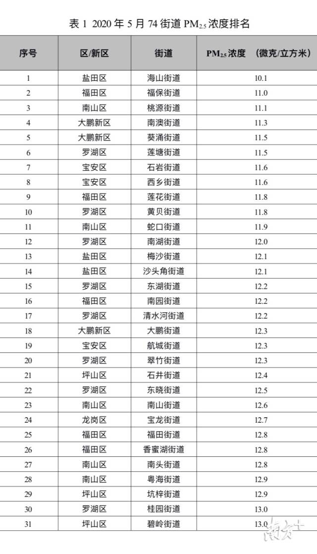 南方網(wǎng)2020年6月15日訊 6月15日,深圳市生態(tài)環(huán)境局向社會(huì)通報(bào)了全市74個(gè)街道5月份PM2.5濃度排名情況。海山、福保、桃源、南澳、葵涌、蓮塘、石巖、西鄉(xiāng)、蓮花和黃貝等街道名列前十。