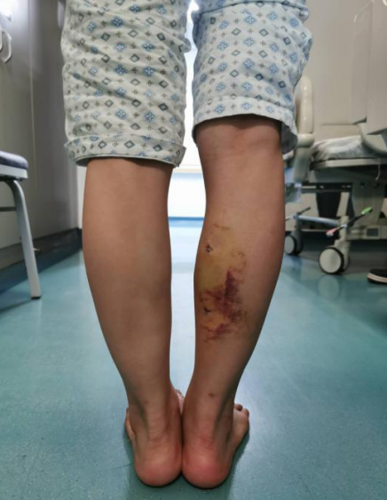 20歲出頭的楊柳(化名)右小腿注射肉毒素后發(fā)生肌肉攣縮,導(dǎo)致右足跟不能著地,雙下肢不等長(zhǎng),跛行。